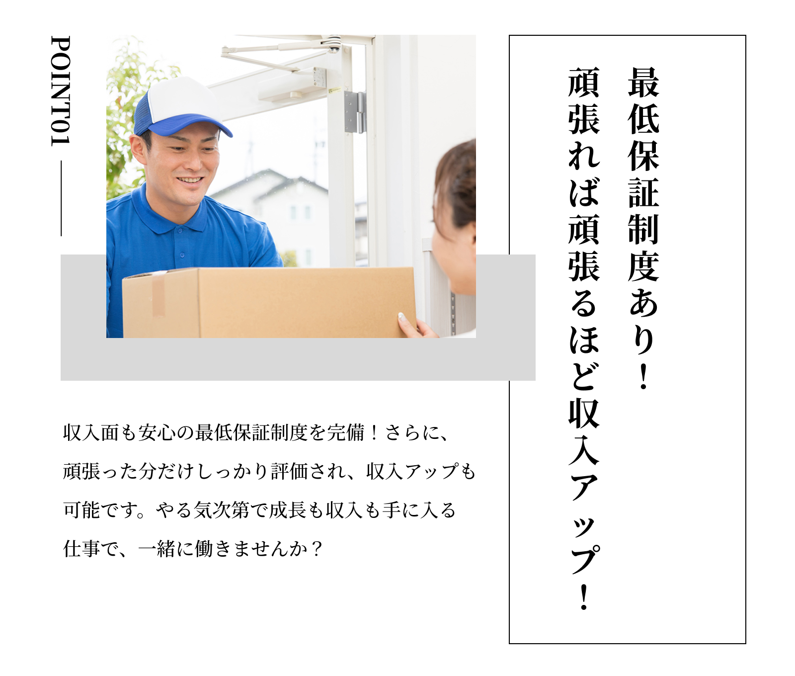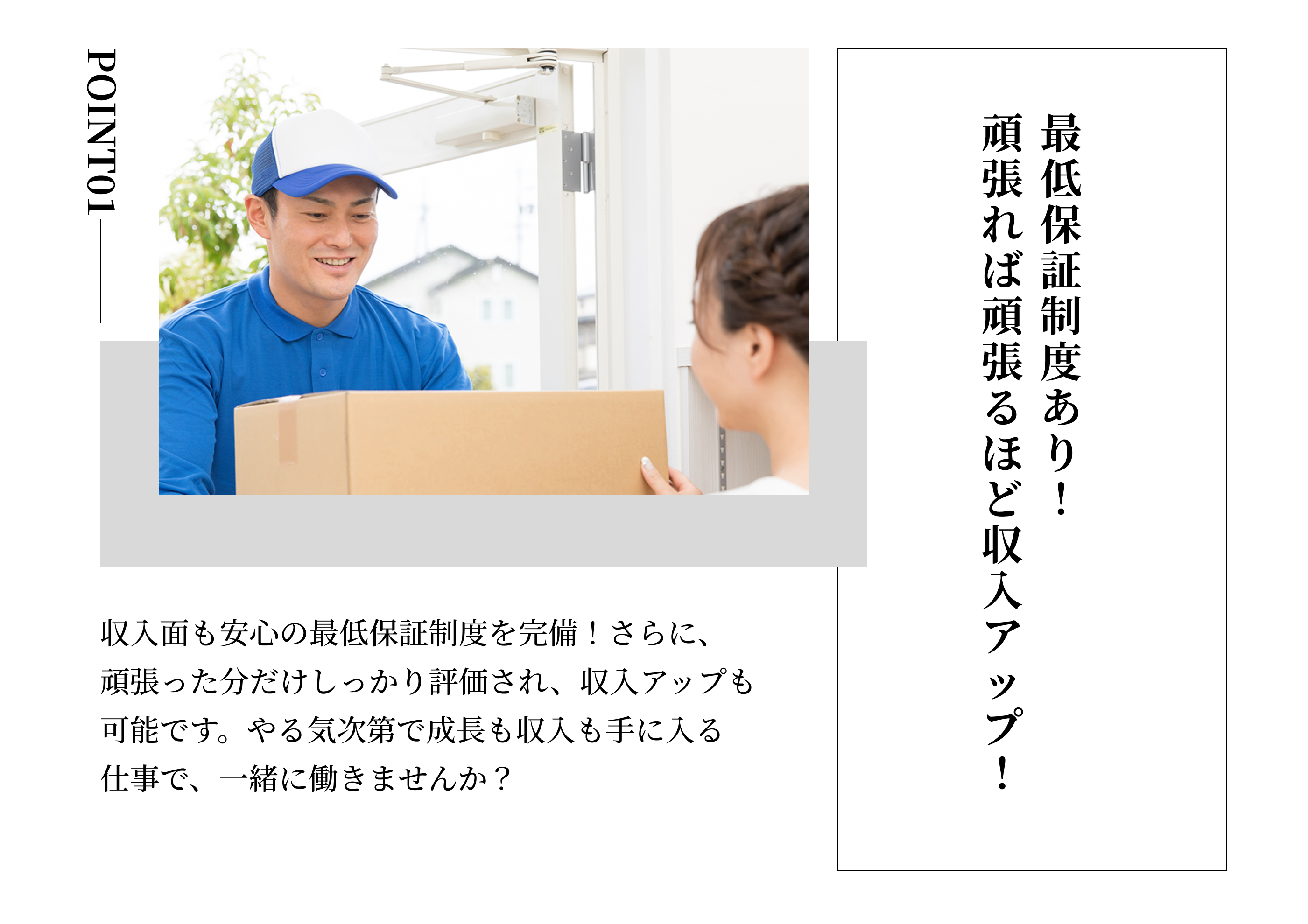 独立した事業主として委託契約を結び、自分でスケジュールを調整しながらお客様の荷物を届けていただく働き方です。報酬は配達個数による完全出来高制となります。