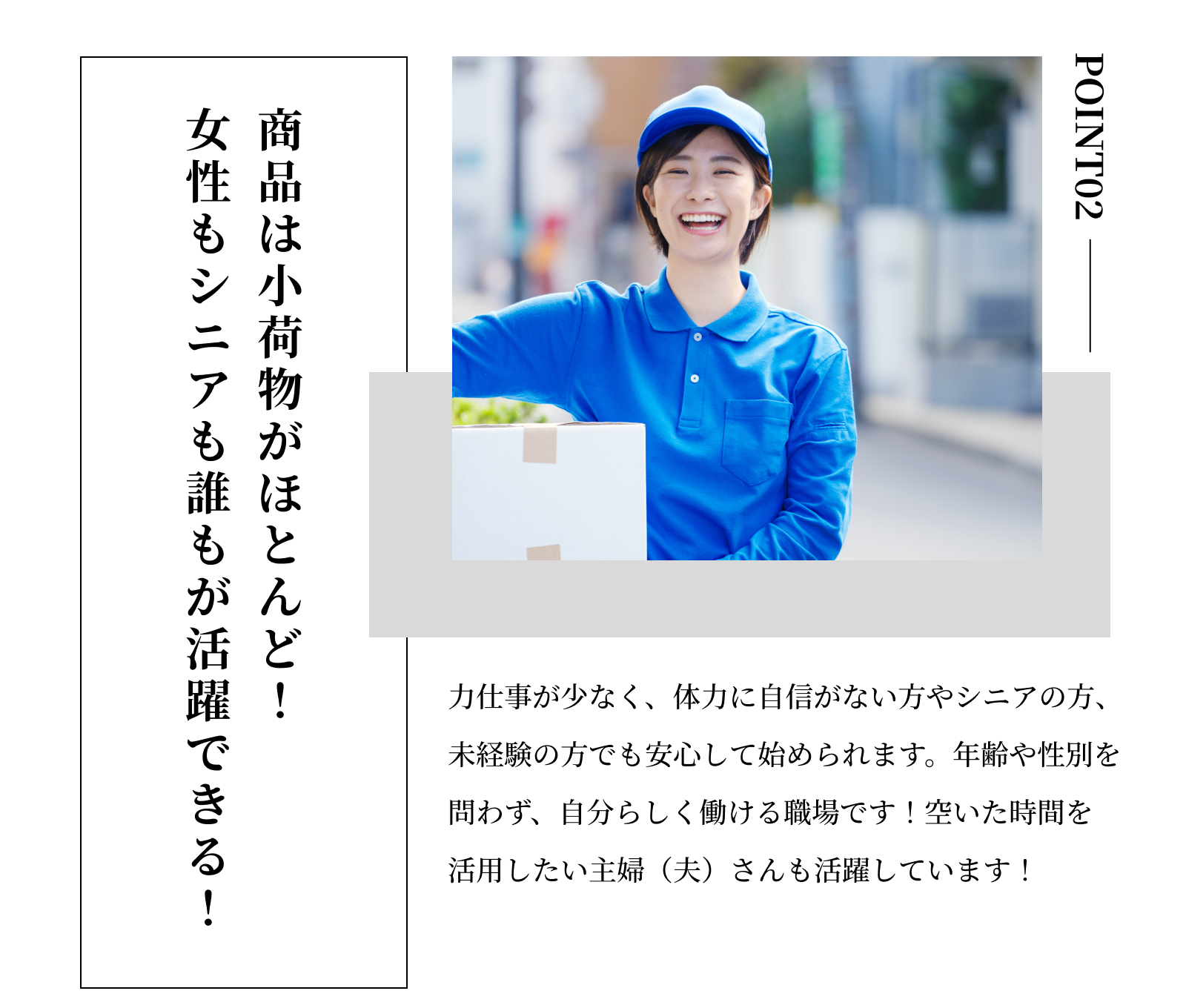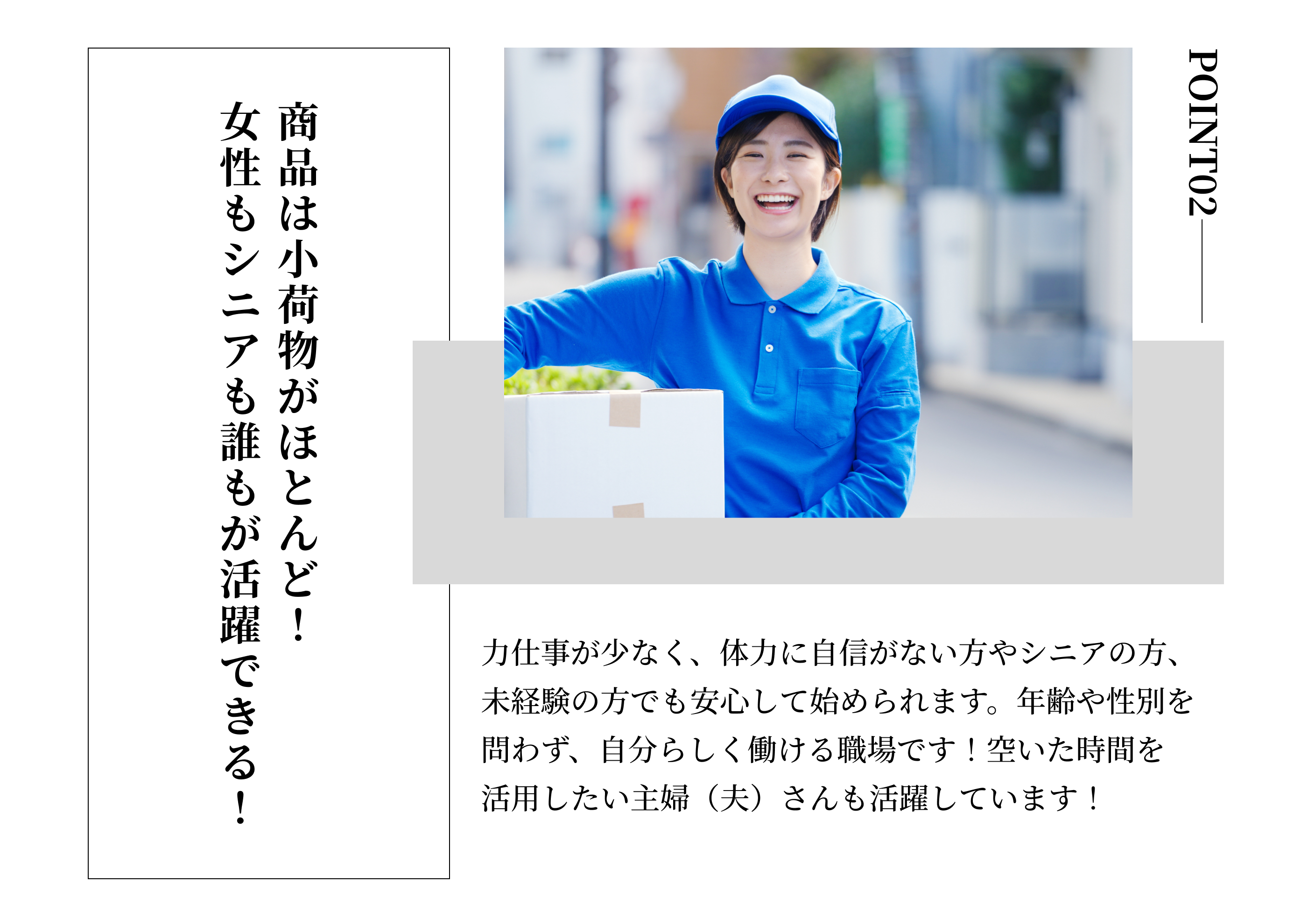 保険や整備などもきっちり行っておりますので、安心して働いていただけます。 お届けいただく商品は小荷物がほとんどなので、未経験からでも活躍いただけます!