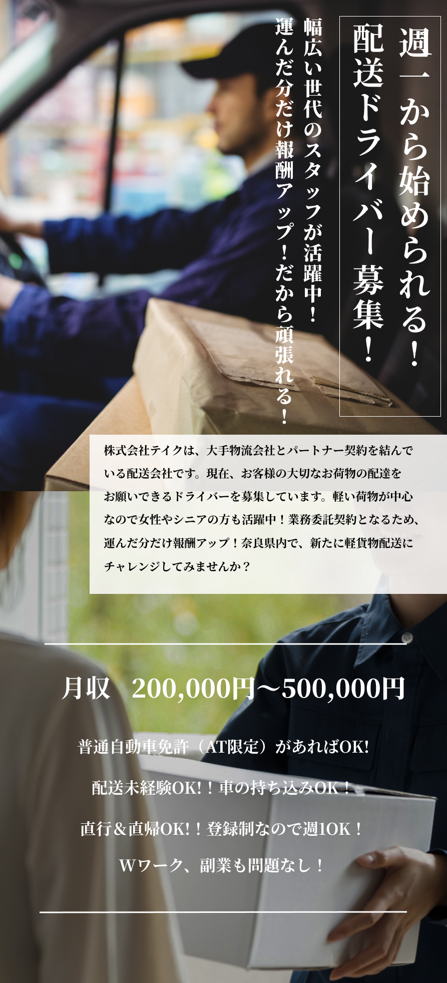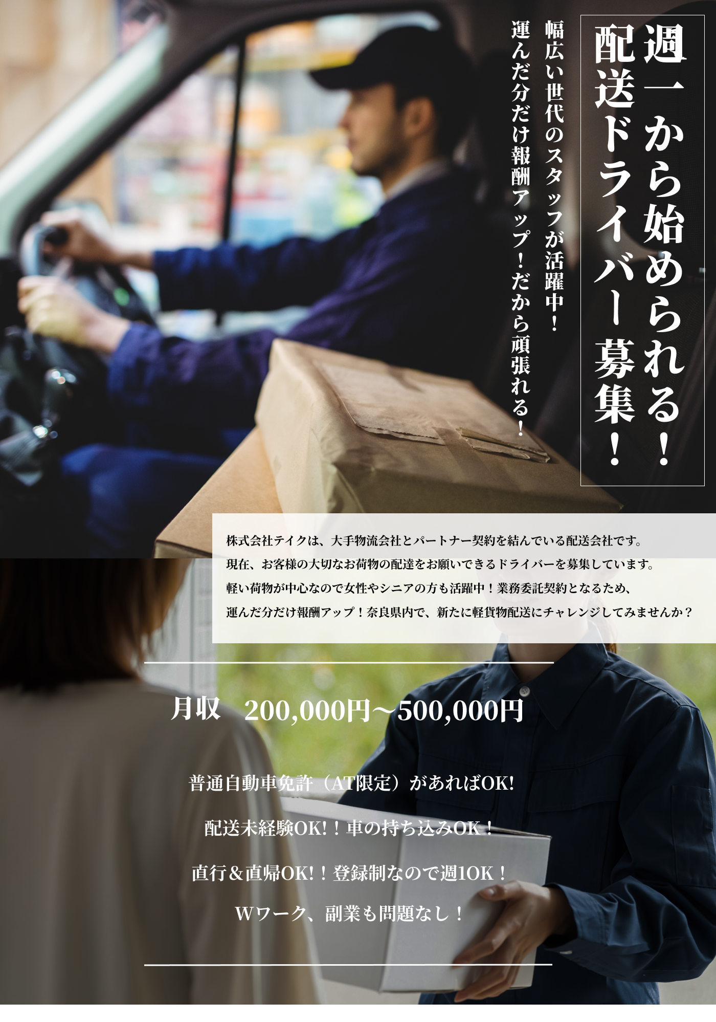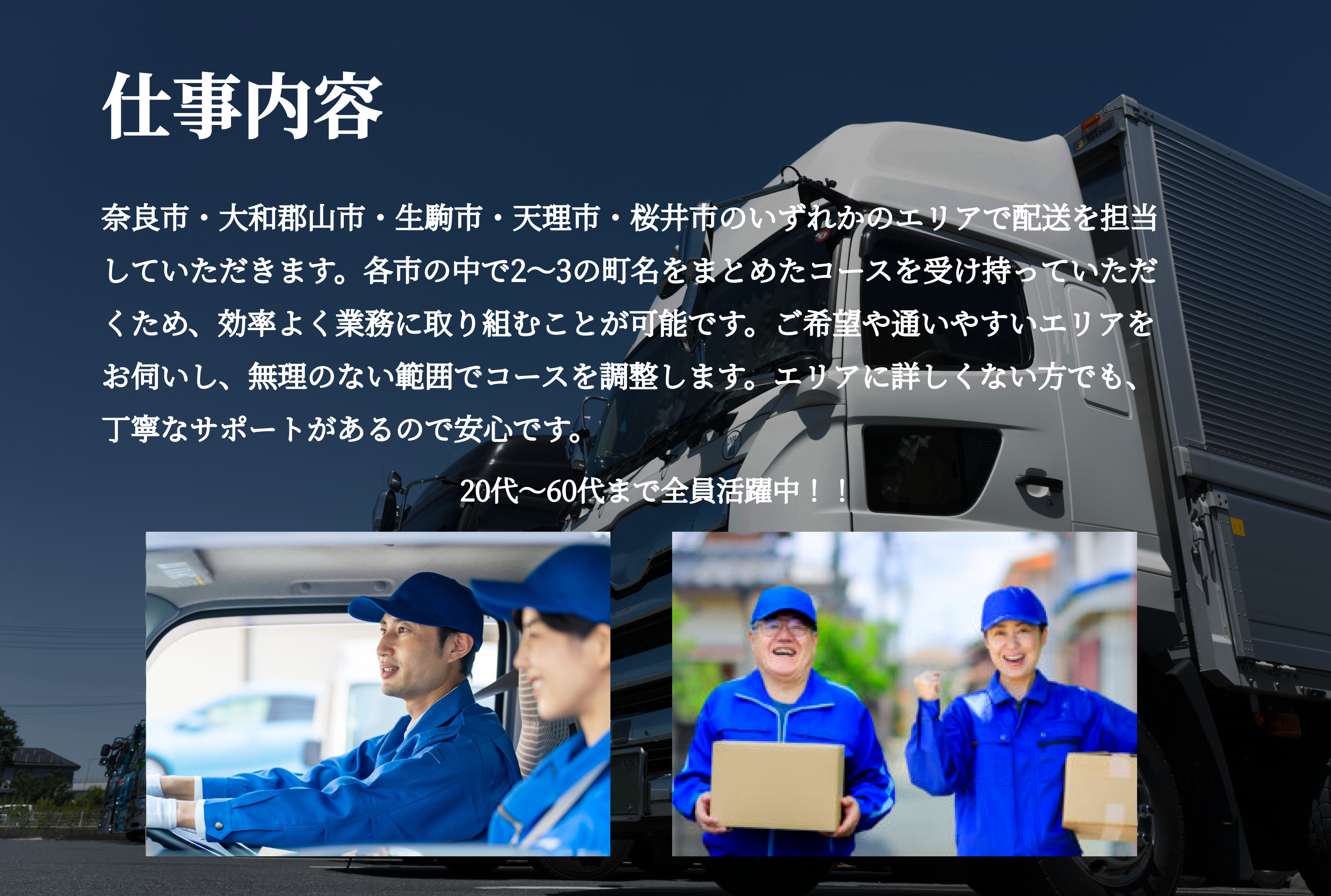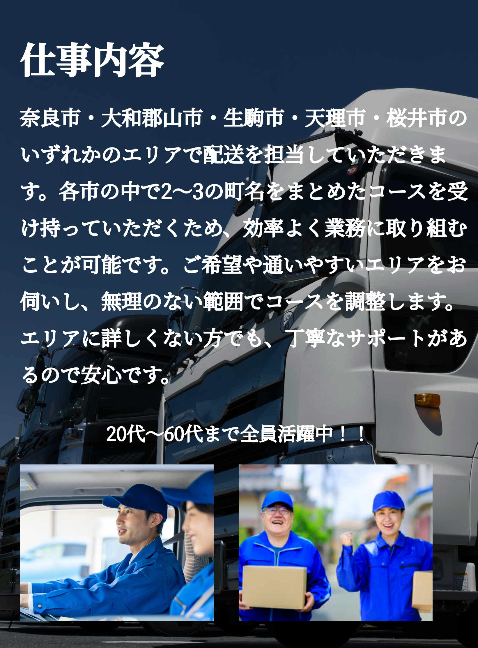 | 仕事内容 | 奈良県内各地(奈良市・大和郡山市・生駒市・天理市・桜井市)の配送 ※奈良市・大和郡山市・生駒市・天理市・桜井市各市の2~3の町名を1コースとして担当して頂きます。(ご希望お聞きいたします) |